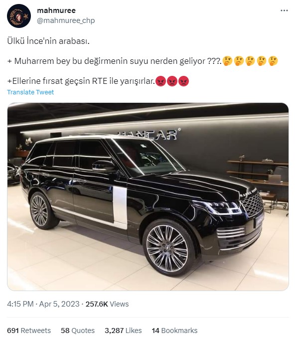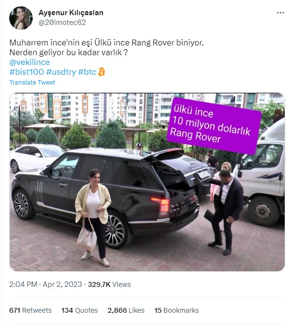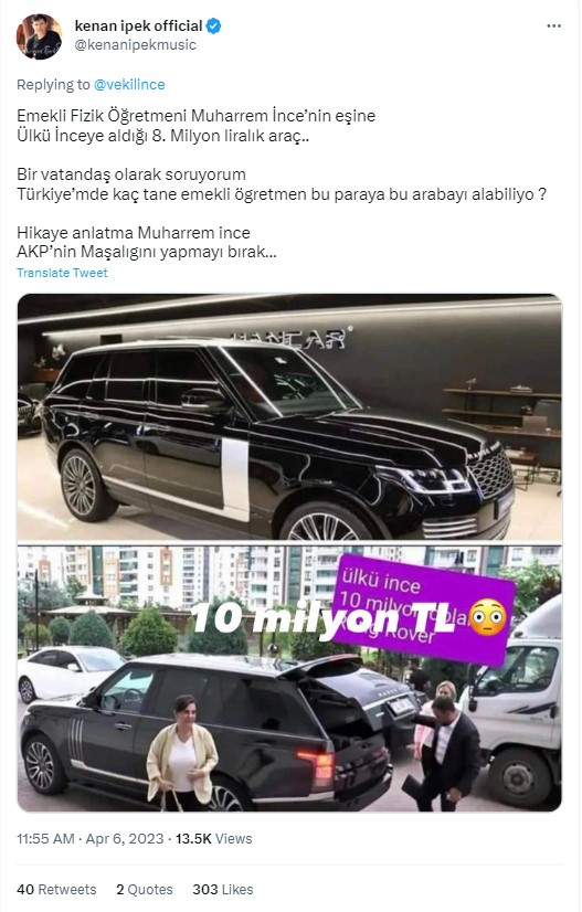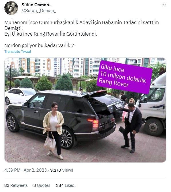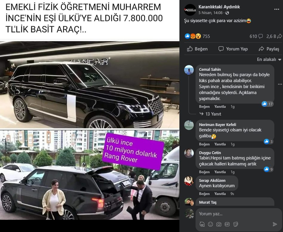 Geçtiğimiz günlerde sosyal medyada Memleket Partisi Genel Başkanı Muharrem İnce’nin eşi Ülkü İnce hakkında bir iddia ortaya atıldı. Ülkü İnce’nin lüks bir aracın yanında görüldüğü görseli kaynak alan iddiada, 10 milyon dolarlık Range Rover’ın İnce’ye ait olduğu ima edilerek ‘aracın İnce ailesi tarafından nasıl alınmış olabileceği’ sorgulandı.