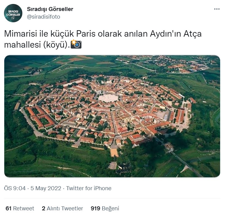 Her ne kadar fotoğraf Aydın’ın Atça mahallesini göstermese de, Atça yerleşkesi Google Haritalardan ya da diğer uydu görüntüsü servislerinden kuşbakışı olarak gözlemlendiğinde, benzer bir tasarım planıyla inşa edildiğini görebilmek mümkün.