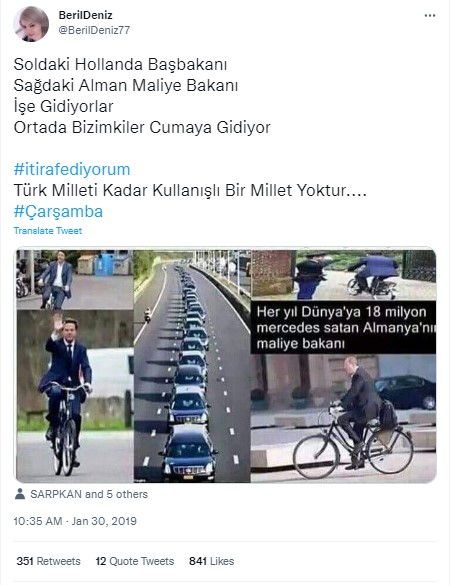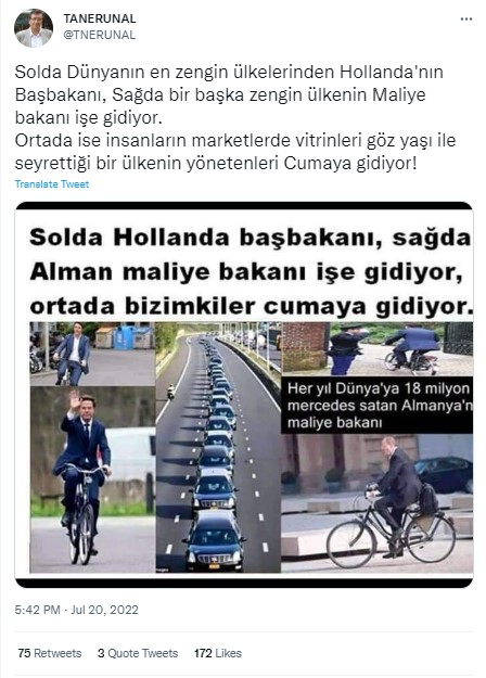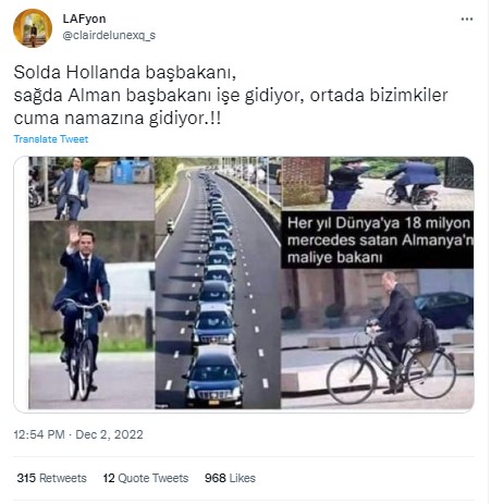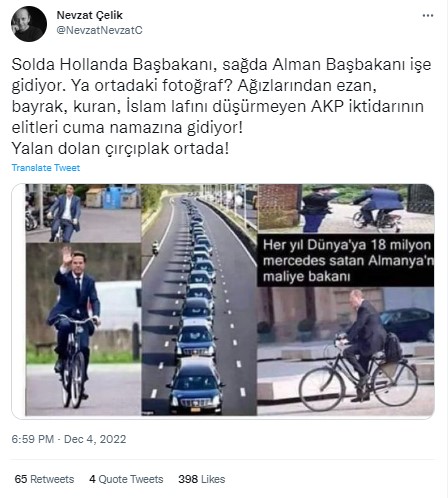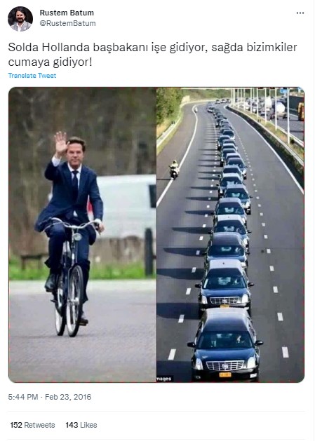 Geçtiğimiz günlerde sosyal medyada Hollanda ve Almanya başbakanlarının bisikletle işe gidişini gösteren görseller paylaşıldı. Paylaşımlara eklenen araç konvoyu fotoğrafı ve ‘bizimkiler’, ‘AKP iktidarı’ gibi ifadelerle cuma namazına giden araç konvoyu arasında karşılaştırma yapıldı. Dolayısıyla söz konusu araç konvoyu görselinin cuma namazına giden kişileri gösterdiği iddia edildi.