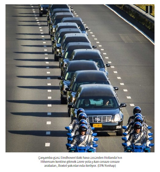 Haberde Malezya Havayolları’na ait MH17 sefer sayılı uçağın düşmesiyle hayatını kaybedenlerin Hollanda’ya getirildiği yazıyor. Söz konusu görselin altına ise ‘Çarşamba günü Eindhoven’daki hava üssünden Hollanda’nın Hilversum kentine gitmek üzere yola çıkan cenaze arabaları, Boxtel yakınlarında ilerliyor.’ notu düşülmüş.