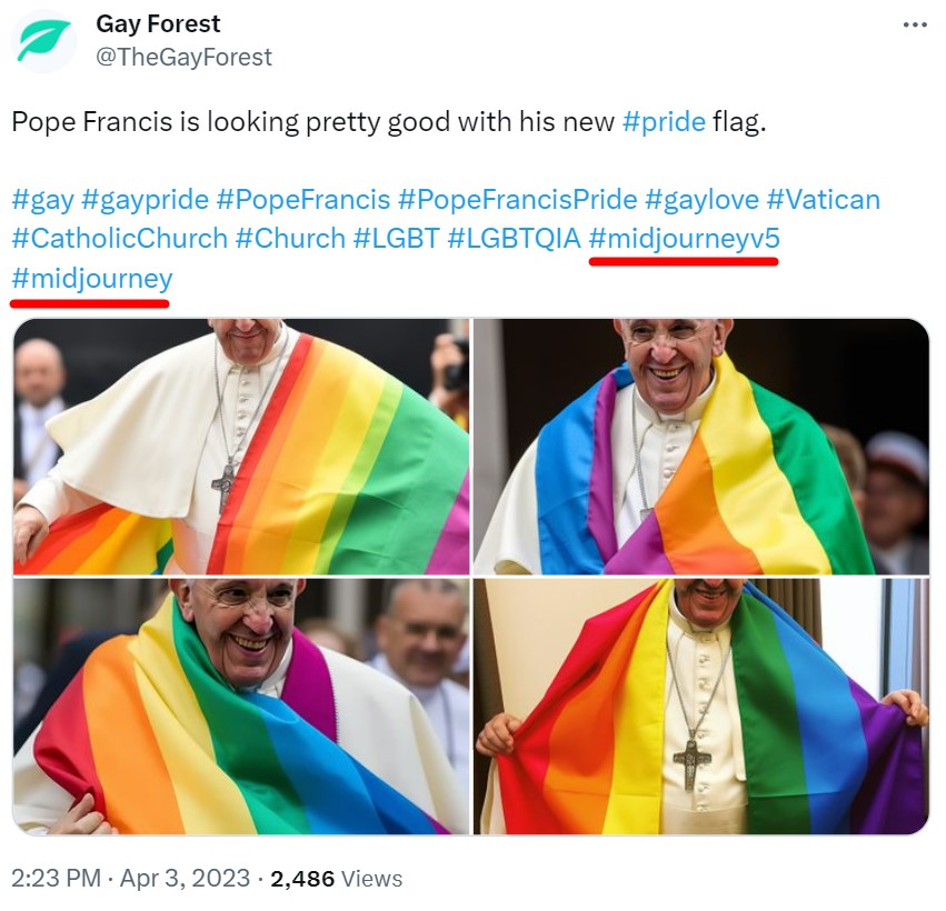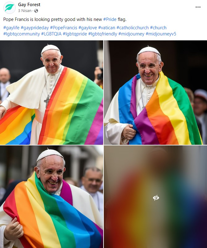 Bulduğumuz paylaşımlarda yeniden eskiye doğru gittiğimizde, görüntülerin ilk olarak “The Gay Forest” isimli bir sayfa tarafından paylaşıldığını görüyoruz. Sayfa, hem Twitter’da hem Facebook’ta da aynı gönderiyi 3 Haziran’da paylaşmış. Yüksek çözünürlükle atılan gönderi açıklamasında bu görüntülerin “Midjourney AI” isimli yapay zeka temelli görüntü oluşturma programının 5. sürümü ile hazırlandığını belirtmiş. Görüntülerde Papa’nın el detayları ve resmin tamamında pastel renklerin hakim oluşu dikkat edildiğinde bunu doğrulamak mümkün.