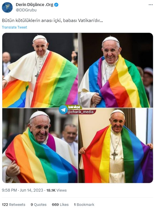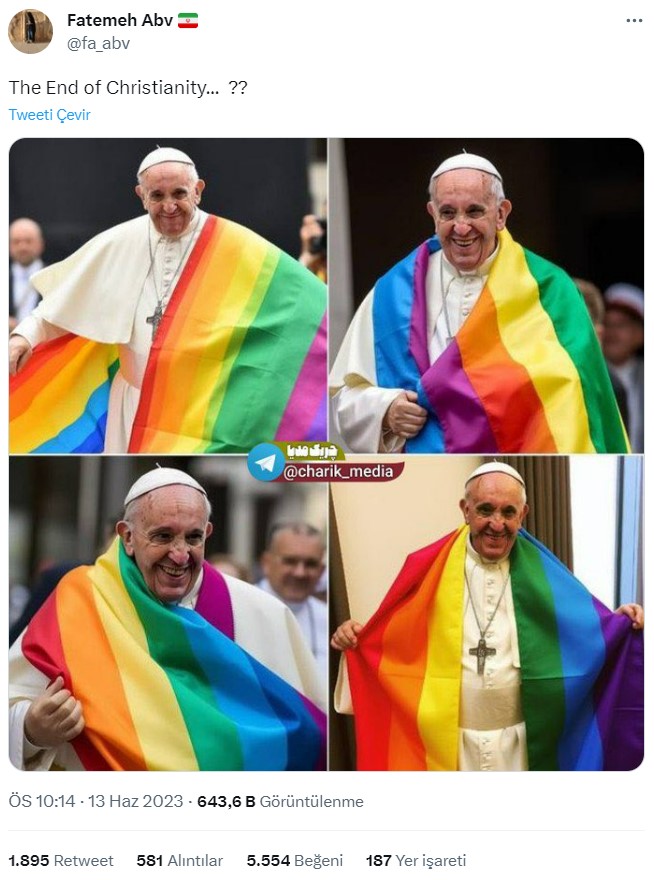 Twitter bir süredir Roma Katolik Kilisesi’nin dini lideri olan Papa Francis ile alakalı bazı görüntüler dolaşımda. Bahse konu görüntülerde Papa’nın sözde LGBTI+ hareketinin benimsediği gök kuşağı renklerinden oluşan bayrağı taşıdığı görülüyor.