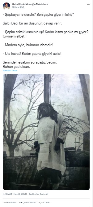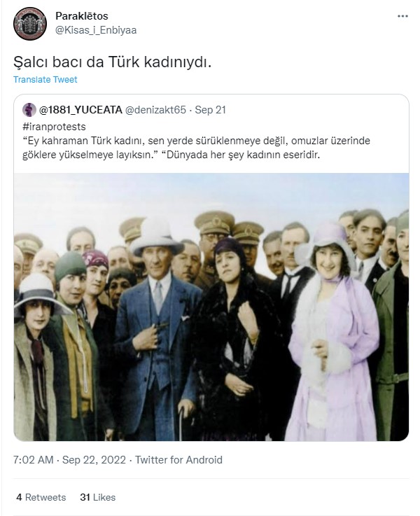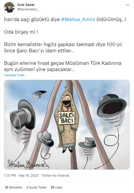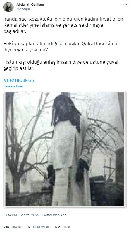 Bazı paylaşımlarda ise, “Sözde Şalcı Bacı lakaplı bir kadının Şapka Kanunu’na karşı çıktığı gerekçesiyle asıldığı” iddiası idam edilmiş bir kadının görseliyle paylaşıldı. Sosyal medya kullanıcıları bu paylaşımı, İran’da yaşanan gerginliği protesto edenlere, karşıt argüman olarak sunuyor ve sözde Türkiye tarihini işaret ediyor.