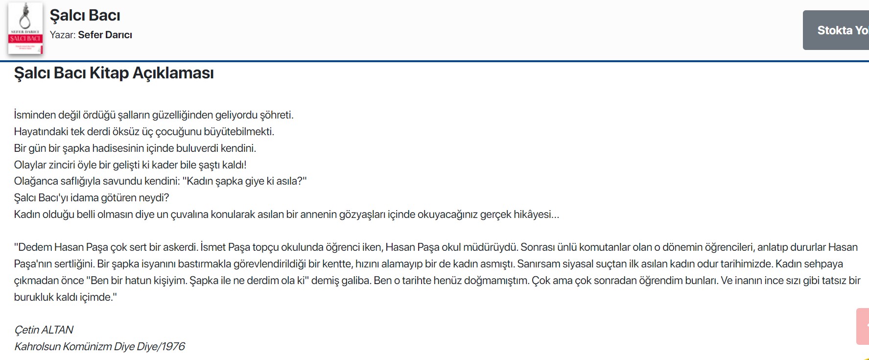 - TBMM ve İstiklal Mahkemeleri tarafından verilen idam cezaları tarandığında ‘Şalcı Bacı lakaplı’ veya ‘Şapka Kanunu’na karşı gelmek’ nedeniyle idam edilen herhangi bir kadın bulunamıyor.