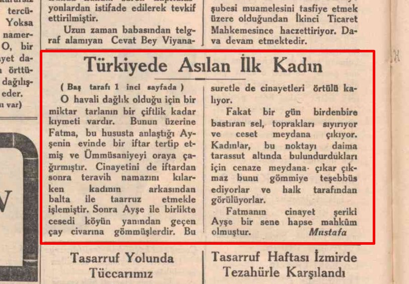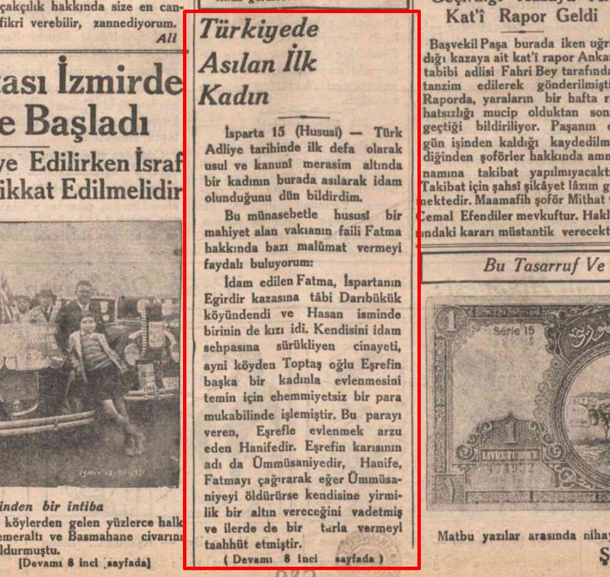 Hikayeden emin olmak adına 14 Aralık 1931 ve takip eden tarihler için gazete arşivlerini taradığımızda Son Posta’nın 15 Aralık 1931 tarihli sayısında yer alan ‘Türkiyede Asılan İlk Kadın’ başlıklı haber karşımıza çıkıyor. Haberde Isparta’nın Darıbükü köyünden Hasan kızı Fatma’nın aynı köyden Eşref’in karısını öldürdüğü için idam cezası aldığı yazılmış.