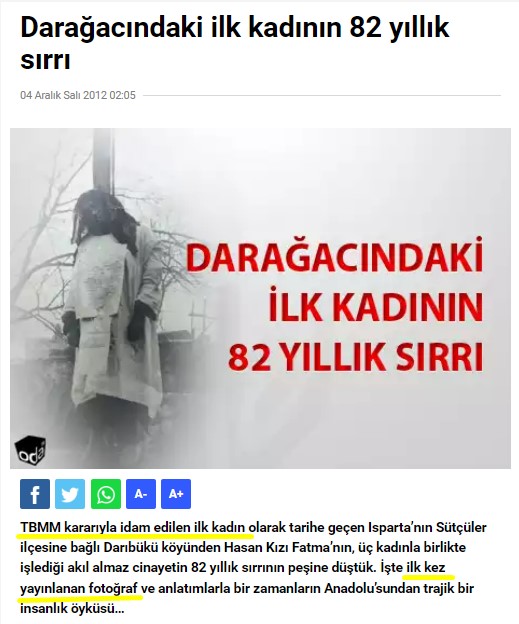 Görseli arattığımızda karşımıza çıkan sonuçlardan bazıları, ele aldığımız iddiaya benzer bilgiler içeriyorken bazıları ise ‘Şalcı Bacı’ adının geçmediği başka bir idam hikayesini anlatıyor. Aralık 2012’de ‘Darağacında ilk kadın’ temalı makaleler birkaç haber sitesinde yakın zaman aralıklarıyla paylaşıldığı görülüyor. Ancak bu makalelerden ilki Yusuf Yavuz’a ait. Gazeteci/yazar Yusuf Yavuz yazısında TBMM kararıyla idam edilen ilk kadın Fatma’dan bahsediyor. Ayrıca makaledeki görsellerin ilk kez yayınlandığının altını çiziyor. Bu görsellerden biri de iddiaya konu olan idam anını gösteriyor.