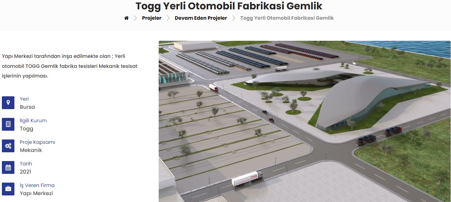Google üzerinde Togg Gemlik fabrika tesisine dair anahtar kelimelerle araştırma yapmaya devam ettiğimizde, Mekatronik Mühendislik ve İnşaat A.Ş. firmasının internet sitesiyle karşılaşıyoruz. Ulaştığımız internet sitesinde yer alan açıklama metninde, “Yapı Merkezi tarafından inşa edilmekte olan ; Yerli otomobil TOGG Gemlik fabrika tesisleri Mekanik tesisat işlerinin yapılması.” ifadelerinin yer aldığını görüyoruz. Başlıkta ise, “Togg Yerli Otomobil Fabrikasi Gemlik” yazıyor. Sitede projeye dair çizimler de mevcut, yer alan tasarım çizimlerinin sosyal medyada paylaşılan iddia görselleriyle uyuştuğunu söylemek mümkün. Bu anlamda gerçek sanılarak paylaşılan görselin, projenin çizimlerine ait olduğu anlaşılıyor.