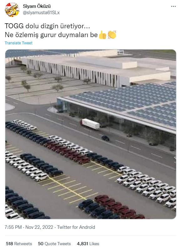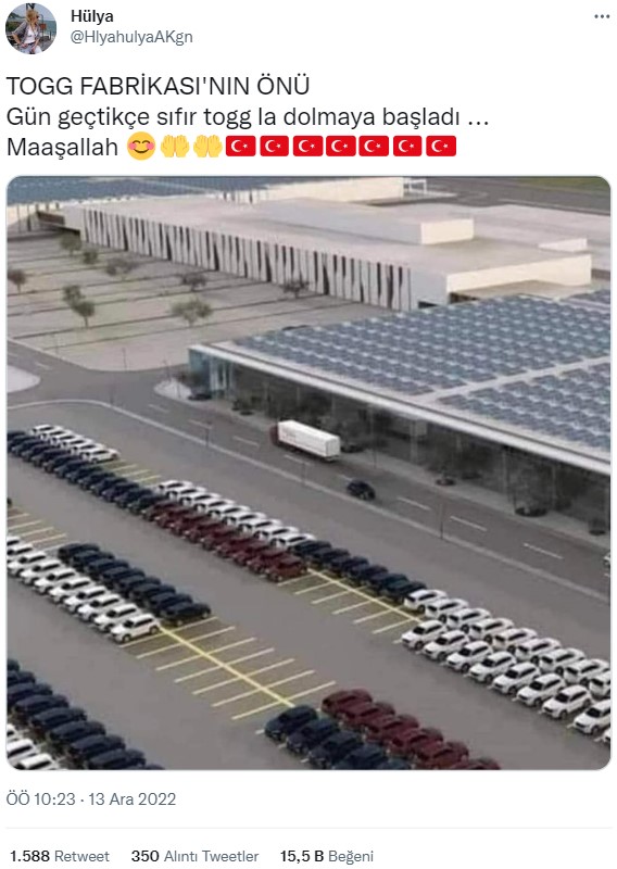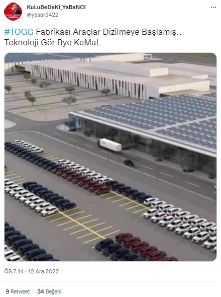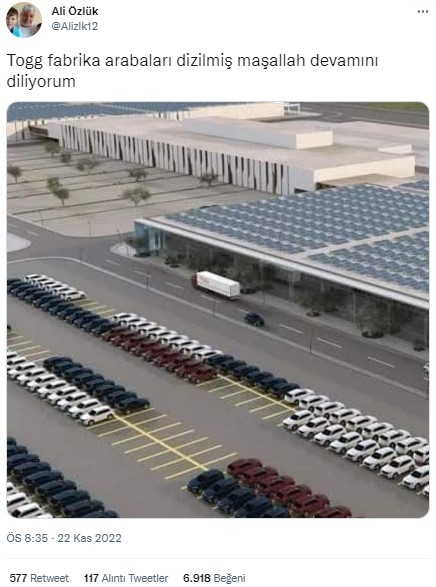 Geçtiğimiz günlerde sosyal medyada paylaşılan bir görüntünün, Togg üretim fabrikasının önünü gösterdiği iddia edildi. Kısa süre içerisinde etkileşim alan görselin, bir süredir sosyal medyada yayılımda olduğu görülüyor. (Tweet daha sonra silinmiş)