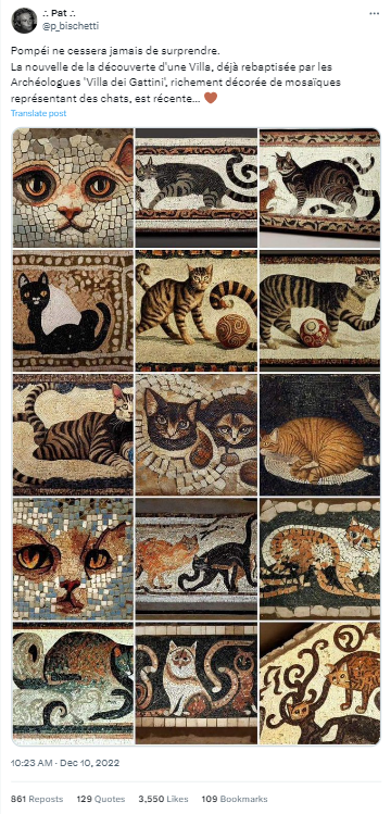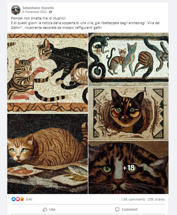 4 Kasım 2022’de görselleri ilk kez ve ‘Pompei’de keşfedilen antik freskler’ notuyla paylaşan Sebastiano Vianello daha sonra yine kendi hesabından görsellerin ve Kedicikler Villası’nın gerçek olmadığına dair paylaşım yaptı.