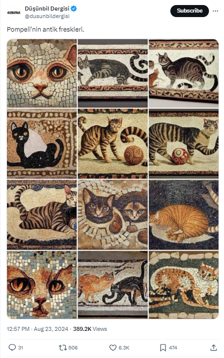 23 Ağustos 2024’te X’te Düşünbil Dergisi sayfasından paylaşılan gönderide kedilerin resmedildiği freskler yer aldı. Gönderi ‘Pompeii’nin antik freskleri’ notuyla paylaşıldı.