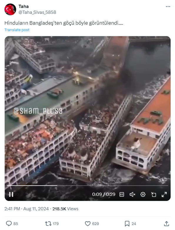11 Ağustos 2024’te yapılan X paylaşımında ise, Hinduların Bangladeş’ten göç ettiği iddiası ortaya atıldı. İddiaya onlarca gemi içinde kalabalık insan gruplarını gösteren bir video da eşlik etti.