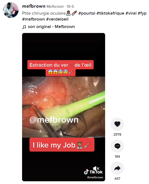 Video, Kamerun’da yaşayan bir Tiktok kullanıcısı tarafından paylaşıldı. Doktor olduğunu iddia eden bu kişinin, görüntüdeki vakanın ‘Pfizer’ aşısından sonra gerçekleştiğine dair bir iddiası yok. Görüntüdeki, Batı ve Orta Afrika’da görülen bir parazit hastalığı. ‘Afrika göz kurdu’ olarak adlandırılan Loiasis, parazitik solucan Loa loa’dan kaynaklanır.