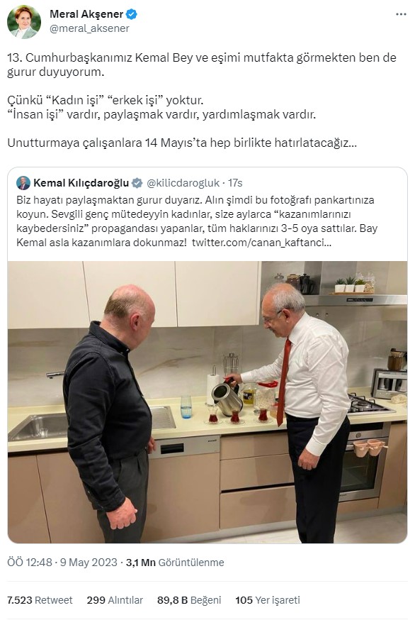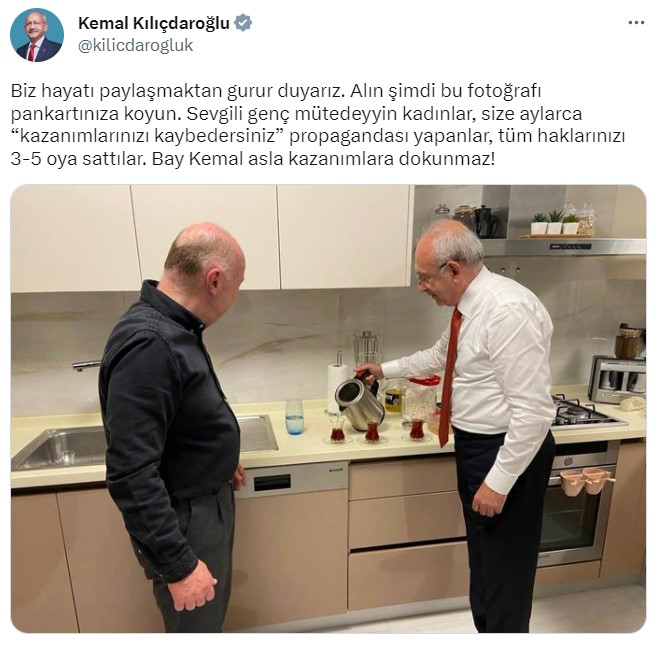 Geçtiğimiz gün Kılıçdaroğlu, mutfakta bardaklara çay doldururken çekilen bir fotoğrafıyla kadın seçmenlere bir söylemde bulunmuştu.