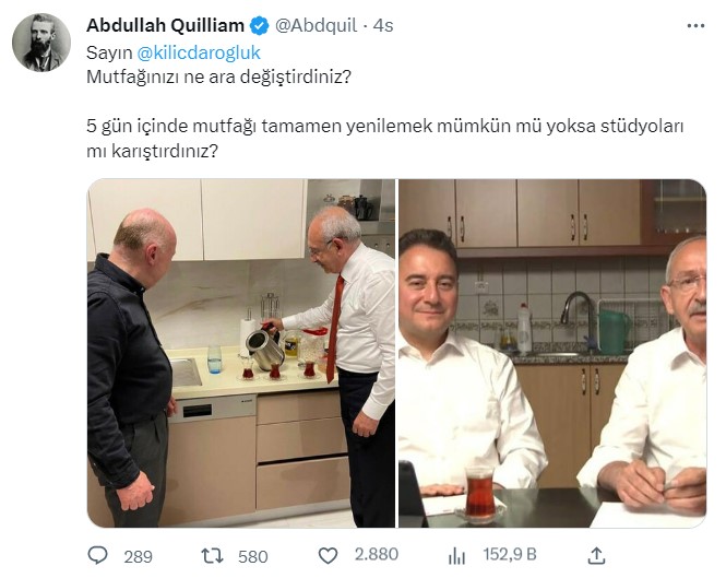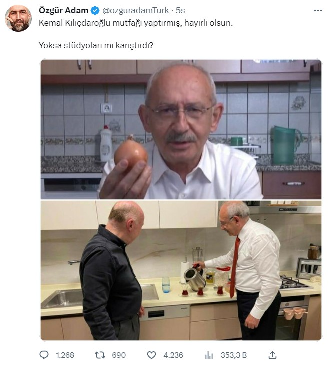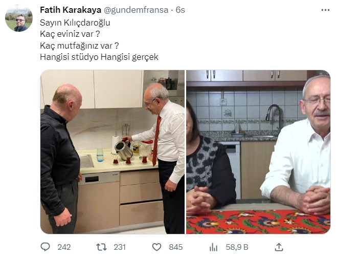 Twitter’da bazı sosyal medya kullanıcısı Kemal Kılıçdaroğlu’nun mutfağını yaptırdığını, birden fazla evi olduğu ve bu yerin diğer evinin mutfağı olduğu gibi iddialar öne sürdüğünü görüyoruz.