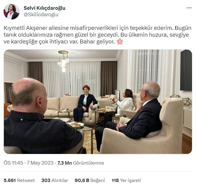Ancak İYİ Parti lideri Meral Akşener’in ve Kılıçdaroğlu’nun eşi Selvi Kılıçdaroğlu’nun Twitter hesabı incelendiğinde, işbu mekanın Akşener’in mutfağı olduğu ve Kılıçdaroğlu’nun yanında yer alan arkası dönük kişinin Meral Akşener’in eşi Tuncer Akşener olduğu anlaşılıyor.