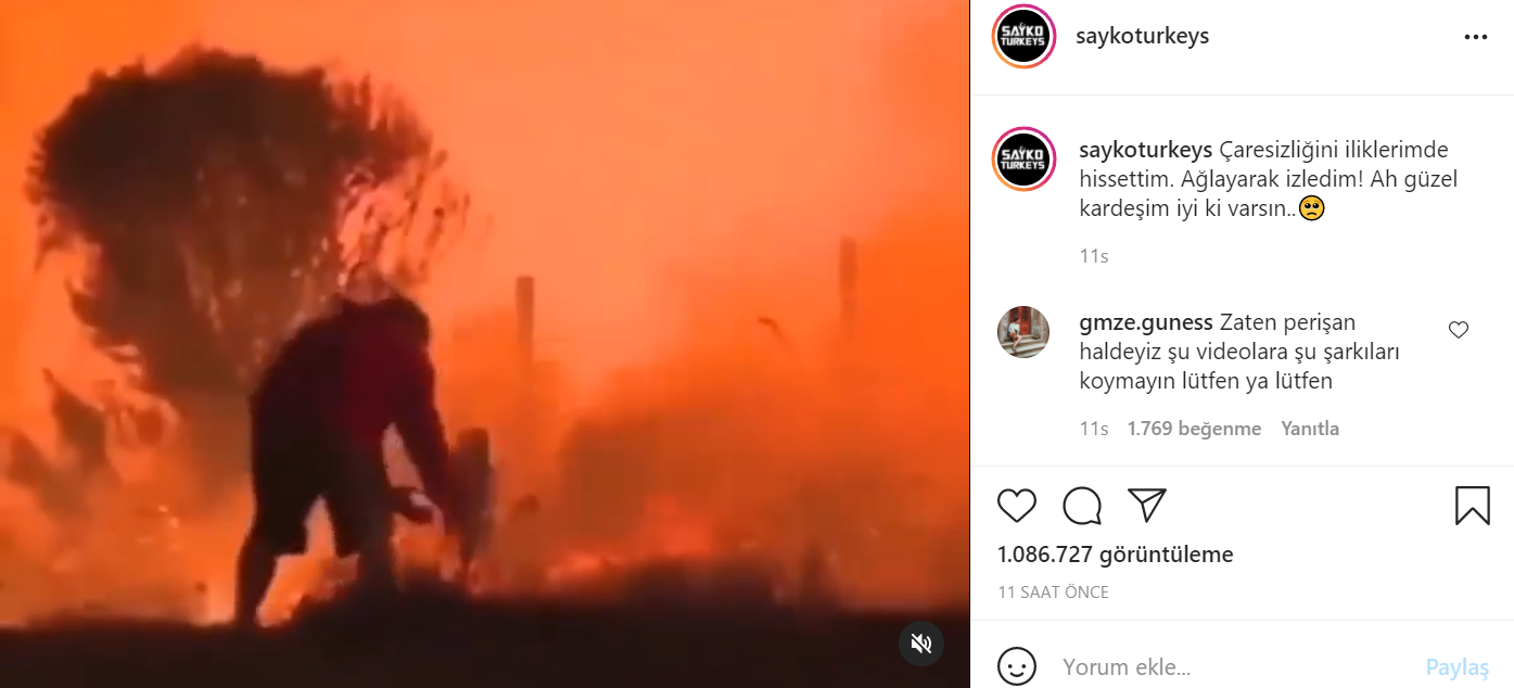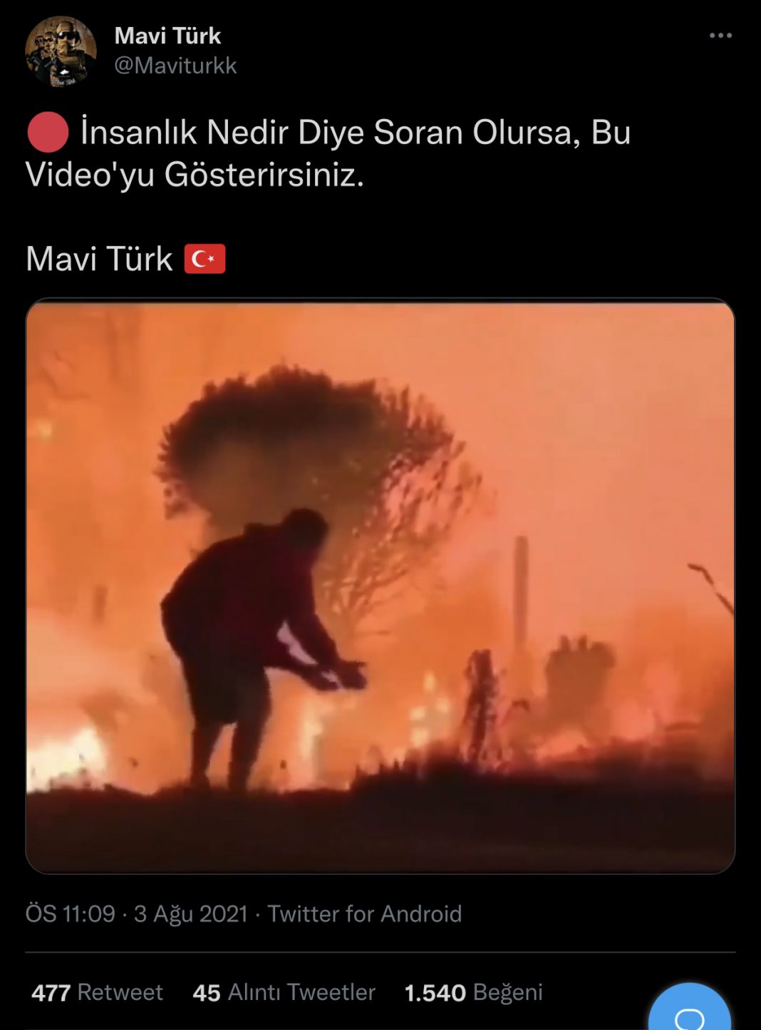 Sosyal medyada yoğun ilgi görerek konuşulan @Maviturkk adlı sayfa tarafından paylaşılan Türkiye’de olduğu iddia edilen orman yangınına ait videonun sonunda ateşin içinden tavşanın kurtarılması izleyenleri duygulandırdı.