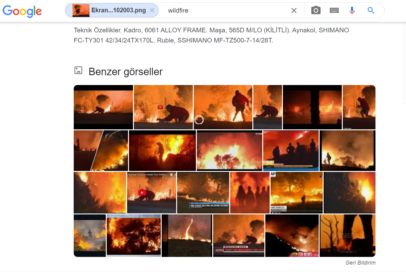 Biz de şüpheler ışığında yol alarak video kaydına ait görselleri görsel arama motorunda arattık ve sonuç şaşırtıcı: Video kaydı Türkiye’deki güncel orman yangınlarında değil Kalifornia’daki orman yangınlarında çekilmiş. Üstelik yeni de değil kayıt 2017 yılına ait.