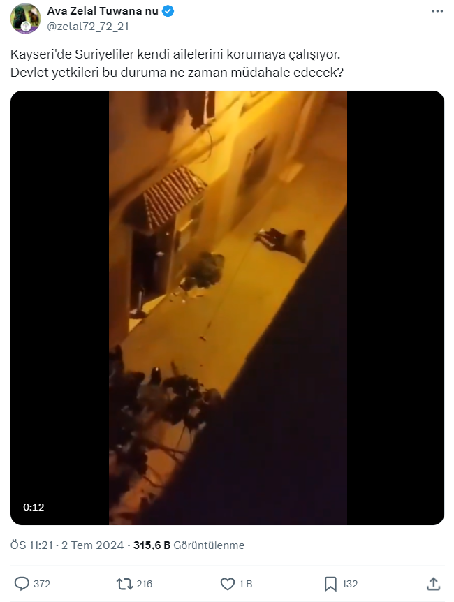 Farklı bölgelerden olaylarla ilgili video ve iddialar ortaya atılmaya başlandı. Söz konusu konuyla ilgili paylaşılan bir videoya Kayseri’de ailesini korumaya çalışan Suriyelileri gösterdiği iddiasıyla paylaşıldı. Videoyu inceledik.