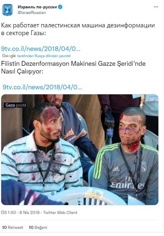 - İddia: Video yurtdışında ise çoğunlukla Filistinlilerin hazırladığı bir kurgunun sahne arkası olduğu iddiası ile paylaşılıyor. Buna göre, Filistinliler bu kurgu ile İsrail’in Filistinli sivillere saldırmış gibi gösteriyor. Yine iddiayı paylaşanlar, bu sahne arkası videosu ile İsrail’e karşı yapılan katliam suçlamalarının yalan olduğunu kanıtlandığını söylüyorlar. İddiayı İsrail devletinin Rusça Twitter resmi hesabı da “Filistin Dezenformasyon Makinesi Gazze Şeridi’nde Nasıl Çalışıyor” tweetiyle paylaştı.