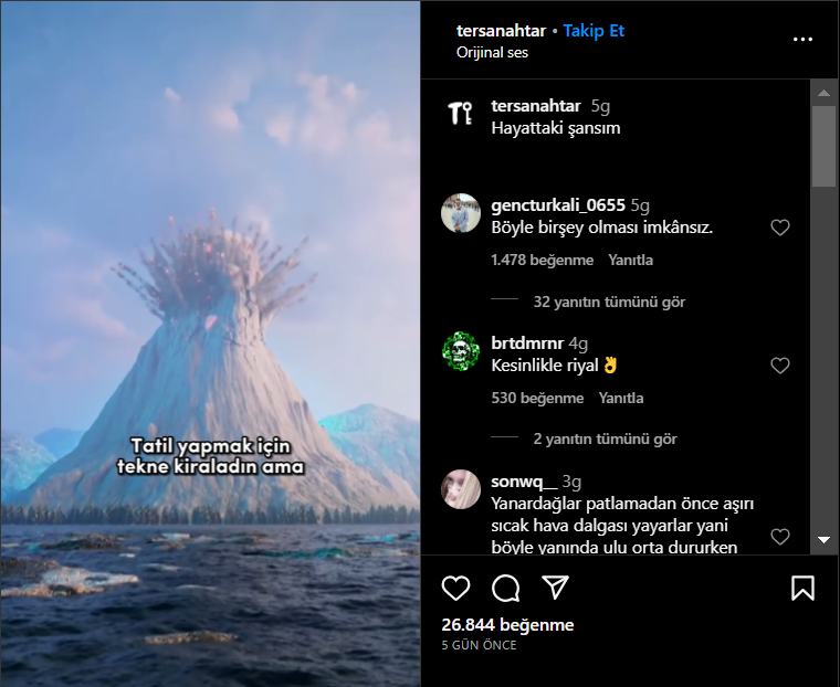 İlk bakışta tekneden kaydedilen volkanik patlamayı gösterdiği düşünülen bir video, sosyal medya kullanıcıları tarafından yüksek etkileşim ve beğeni aldı.