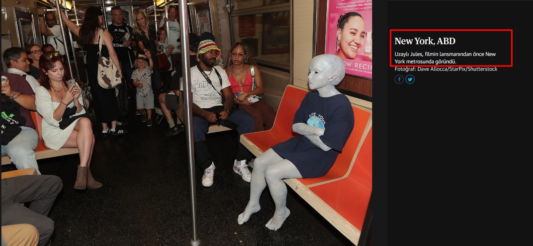 The Guardian’ın 10 Ağustos 2023 tarihinde yayımladığı haberinden ulaştığımız fotoğrafta, “Uzaylı Jules, filmin lansmanından önce New York metrosunda göründü.” metni yer alıyor. Buradan da videonun gerçeği yansıtmadığını anlıyoruz. Görüntüleri araştırmaya devam ettiğimizde film incelemesi yapılan birçok habere de konu olduğu anlaşılıyor.