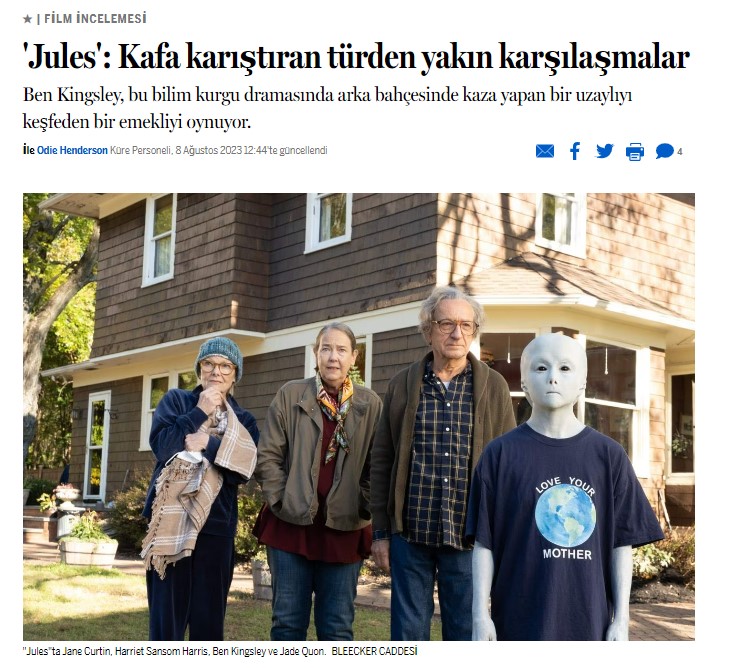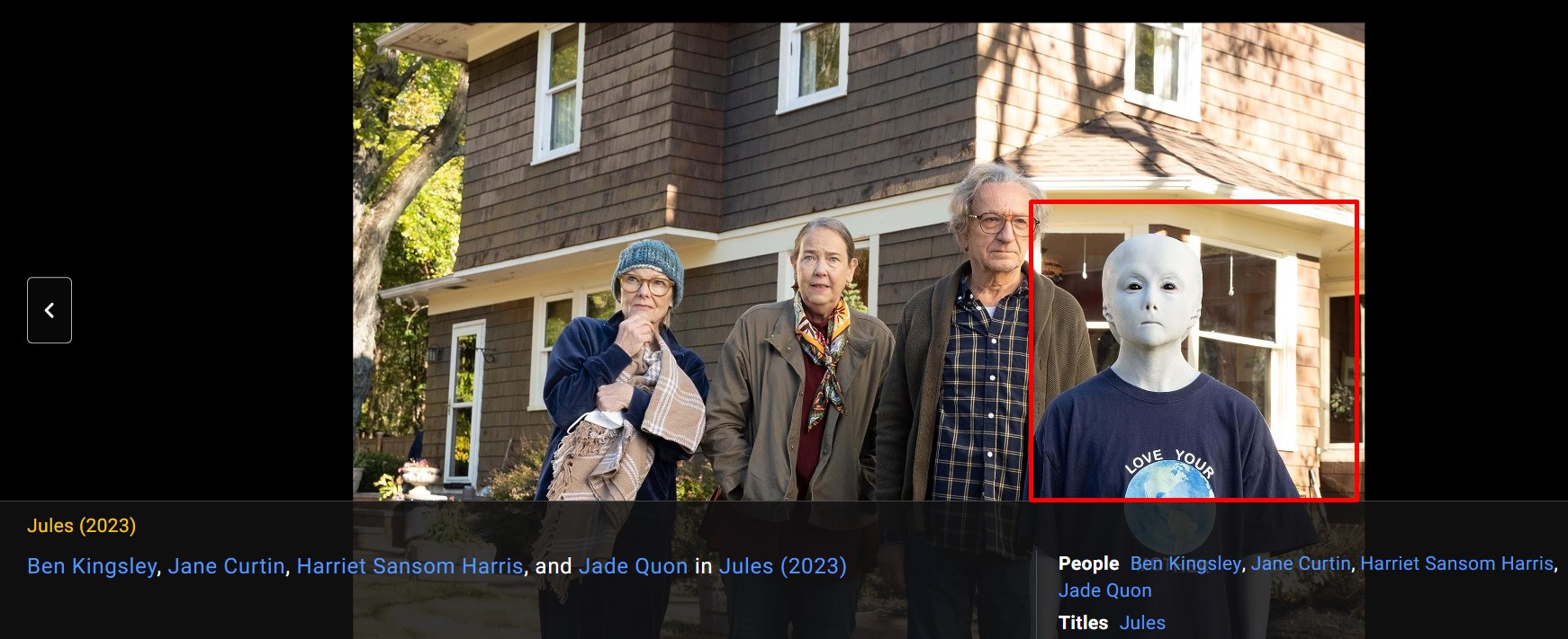 Daha sonra anahtar kelimelerle yaptığımız taramadan bahsi geçen filmin fragmanına ulaşıyoruz. 11 Ağustos 2023’te vizyona giren Jules filminin fragmanında da videodaki kişiyi görmek mümkün.