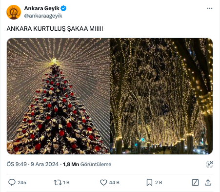9 Aralık 2024’te X’te yapılan bir paylaşıma yılbaşı için süslenmiş iki adet sokak görseli eklendi. Fotoğraflardan biri büyük bir yılbaşı ağacını gösterirken diğeri, ağaçları ışıklarla donatılmış bir caddeyi gösteriyordu. Paylaşımı yapan kişi, görüntülerin Ankara Kurtuluş’ta kaydedildiğini iddia etti.