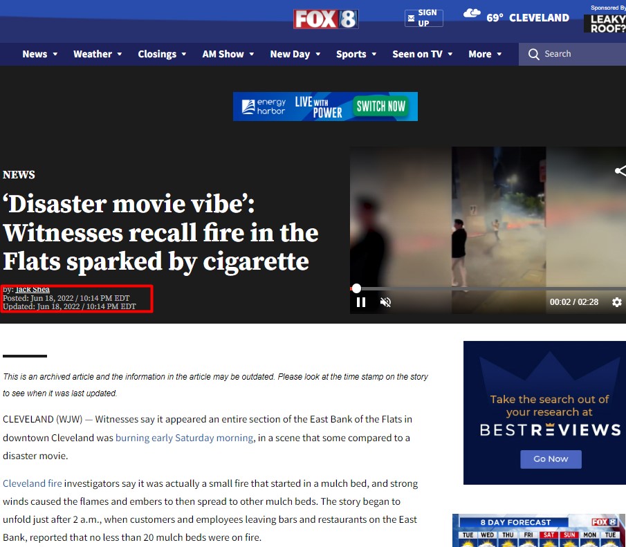 Aramalarımız sonucunda görüntülerin eski tarihli olduğunu görüyoruz. Fox 8’in haberine göre ilgili yangın, ABD’nin Ohio eyaletine bağlı Cleveland şehrinde gerçekleşmiş. 18 Haziran 2022 tarihli haberde Cleveland itfaiye teşkilatının, olayın aslında bir malç yatağında çıkan küçük bir yangından kaynaklandığını, kuvvetli rüzgarların alevlerin ve közlerin diğer malç yataklarına yayılmasıyla yangının oluştuğunu söylemişler.