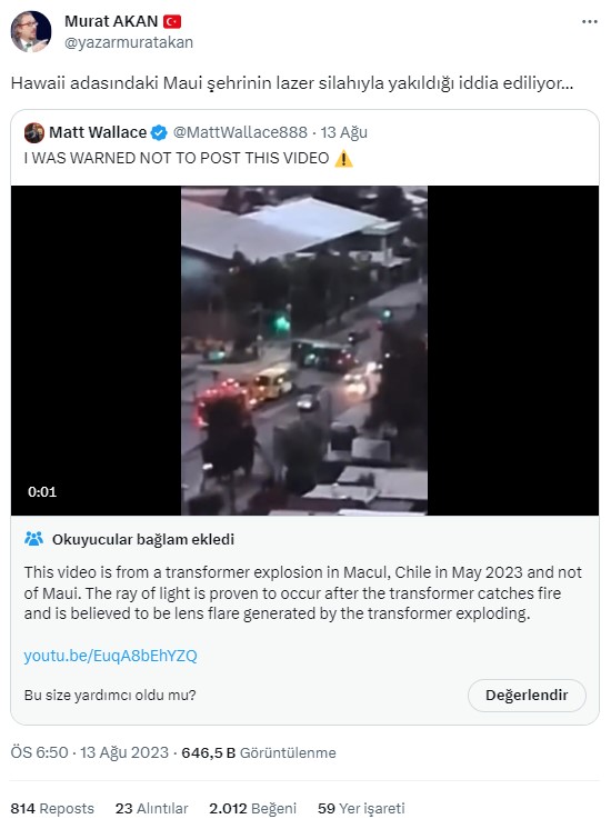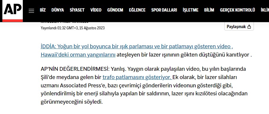 - Hawaii merkezli yangınların gökyüzünden ‘lazer ışını’ yoluyla çıkarıldığı iddiasıyla paylaşılan görüntü ise Mayıs 2023’te Şili’de bir trafo patlamasını gösteriyor. Yangın çıkarabilecek güçte bir lazerin bilimsel olarak insan gözüyle görülmesinin mümkün olmadığı biliniyor.