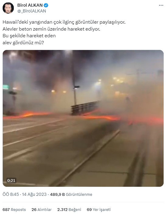 “Hawaii’deki yangından çok ilginç görüntüler paylaşılıyor. Alevler beton zemin üzerinde hareket ediyor. Bu şekilde hareket eden alev gördünüz mü?”