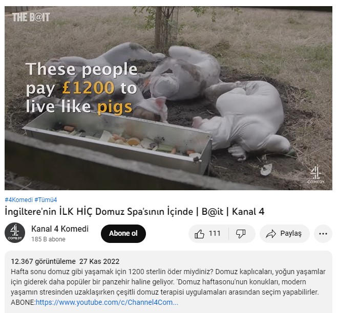 Videodaki kişilerin, domuz kostümü giyip, bir domuz gibi yaşamak istediği ve bunun için 1200 pound ücret ödediği iddia edilmişti. İddiayı incelemek için öncelikle videonun sol üst kısmında bulunan “The B@it” ismini Google’da aratıyoruz. Tahmin ettiğimiz gibi bu görüntülerin aslında mizah amaçlı çekilen bir kurgu videosu olduğunu görüyoruz.