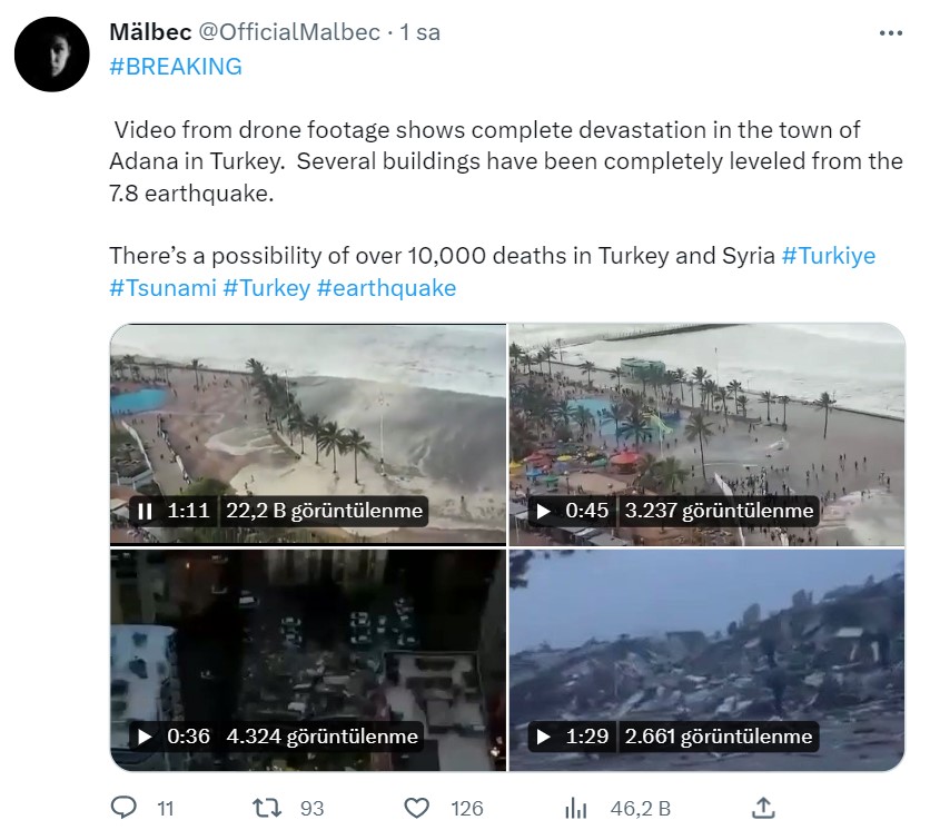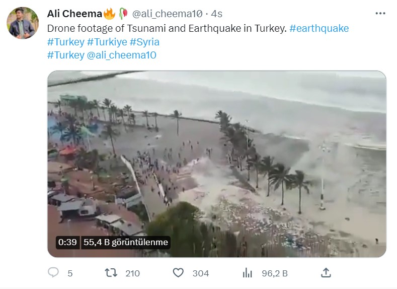 Bu konu ile alakalı Adana’da kaydedildiği iddia edilen bir görüntü, bazı yabancı Twitter kullanıcıları tarafından paylaşıldı. Deprem sonrası denizdeki dalgalanmaları gösteren videoda, insanların kıyı şeridinden hızla kaçtığı görülüyor.