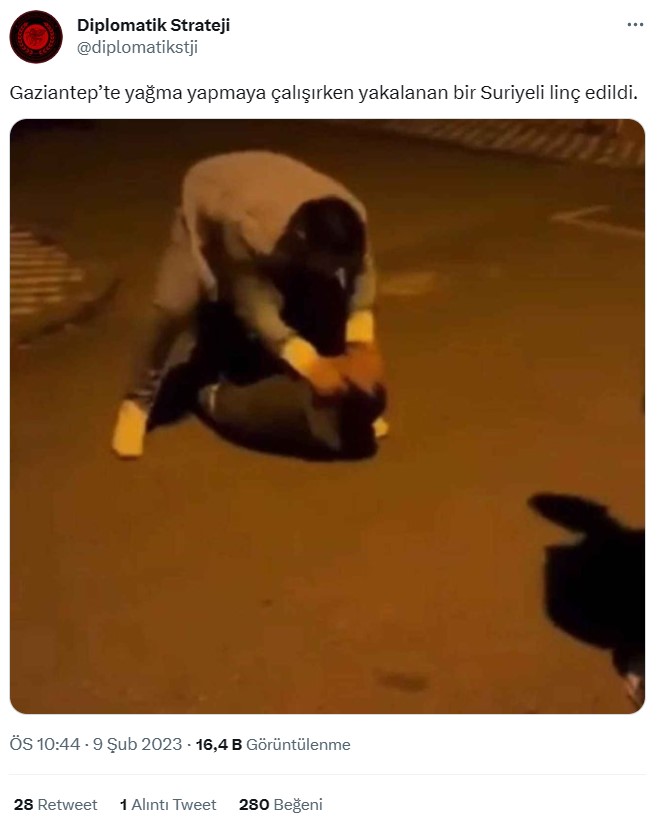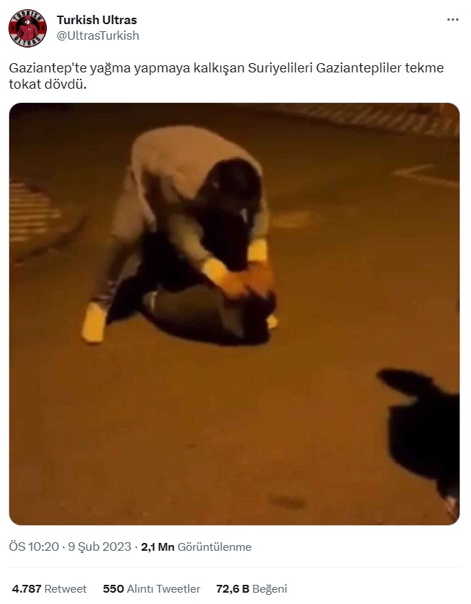 Depremin etkilediği on şehirde ortaya çıkan yağmacılık faaliyetleri birçok kişiyi endişelendirdi. Gaziantep’te bir grup kimliği belirlenemeyen kişinin, sözde yağmacılık yaptığı belirtilen bir Suriyeliyi dövdüğü iddia edilen görüntü, birçok hesap tarafından paylaşıldı.