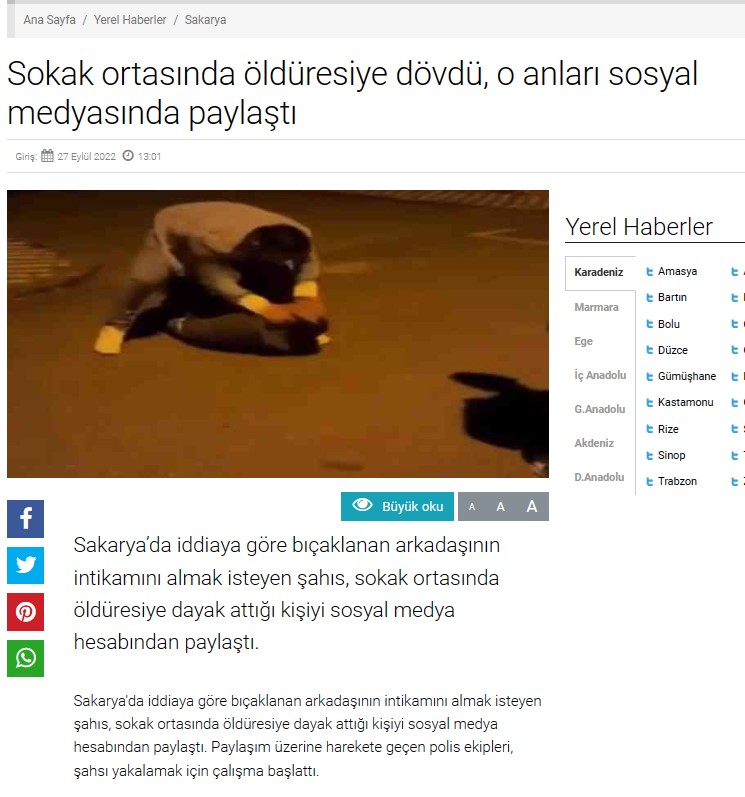 İddiaya göre sokak ortasındaki dayak olayı, geçtiğimiz günlerde Serdivan ilçesinde yaşanan kavgada K.A. isimli gencin bıçakla yaralanması sonrasında yaşandı. G.Ö. isimli şahıs, arkadaşı K.A.’yı bıçakladığını iddia ettiği bir kişiyi sokak ortasında öldüresiye döverek hastanelik etti. G.Ö. isimli şahıs o anları sosyal medya hesabında da paylaştı. Cep telefonu kamerasıyla kaydedilen görüntülerde; şahsın, ismi henüz öğrenilemeyen bir kişiyi öldüresiye darp ettiği esnada, küfür ve hakaretler ettiği anlar yer aldı. Sosyal medyada paylaşılan görüntüler üzerine harekete geçen polis ekipleri şahsı yakalayabilmek için çalışma başlattı.