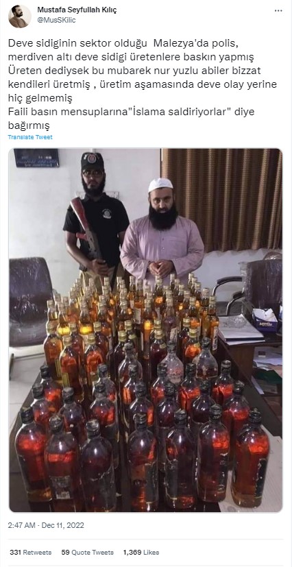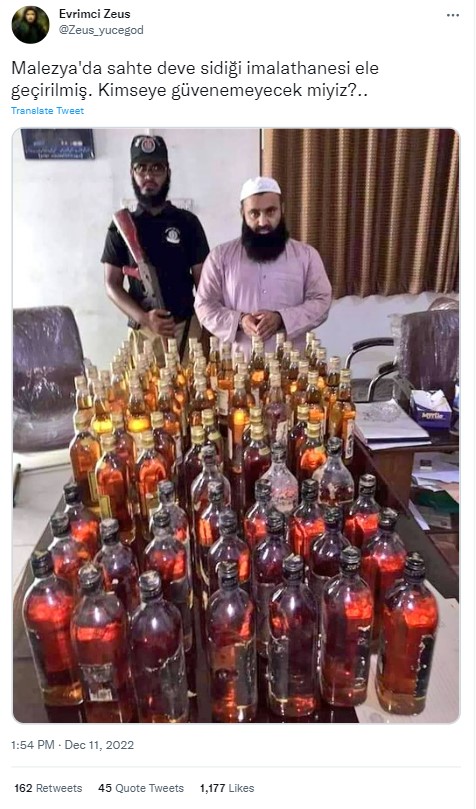 Dolayısıyla Malezya’da sahte deve idrarı üretimi yapan bir imalathaneye ait olduğu iddia edilen görsel, Pakistan’da ithal içkileri satmaktan tutuklanan gümrük çalışanını gösteriyor.