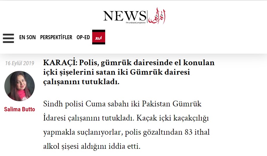 Pakistan haber kanalı ARY News’in 13 Eylül 2019 tarihli haberinde konu detaylarıyla açıklanmış. Habere göre, Younus ve Khalid isimli iki gümrük çalışanı kendi departmanları tarafından el koyulan en az 83 likör şişesini satmaktan tutuklanmış.