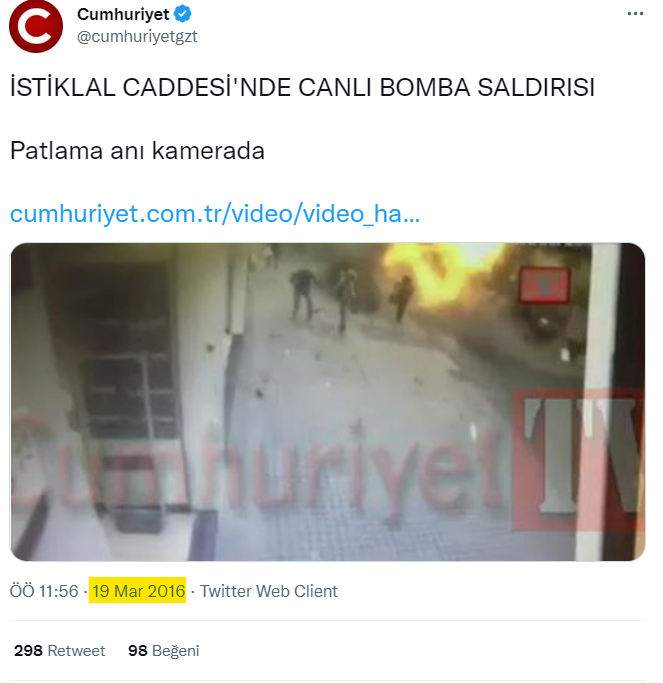 13 Kasım 2022 Pazar günü saat 16.00 sularında Taksim’de bir patlama gerçekleşti. Patlamanın ardından sosyal medyada bir görüntü yayılıma girdi. Görüntünün 13 Kasım’daki patlamadan olduğu iddia edildi.