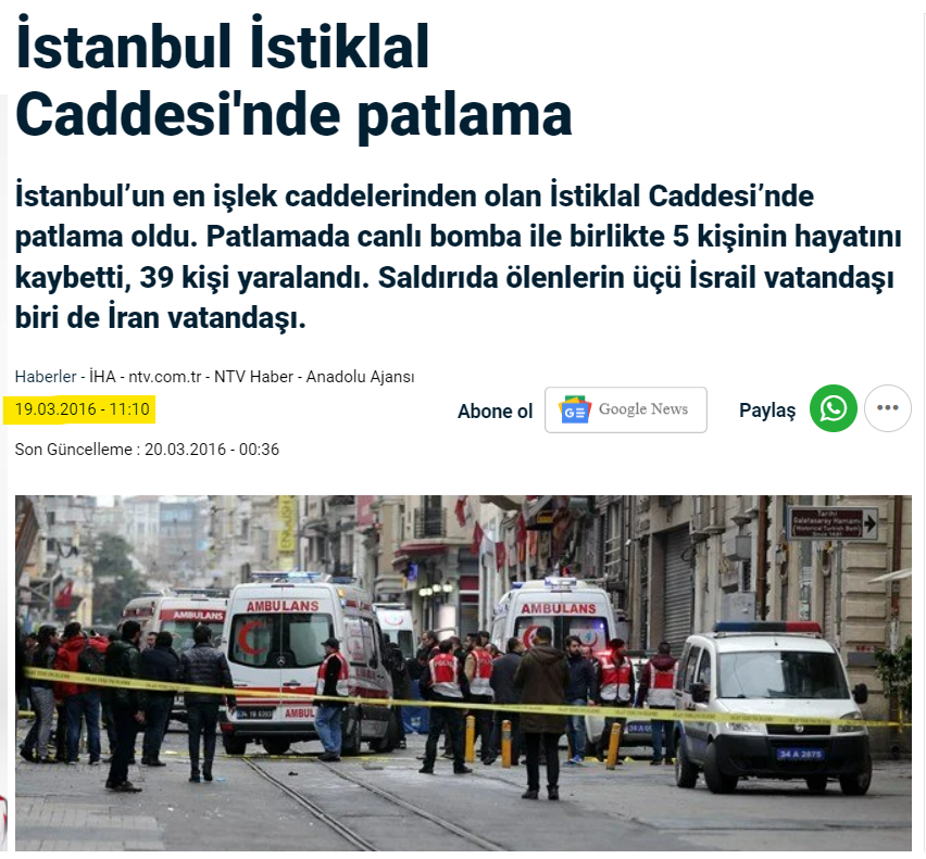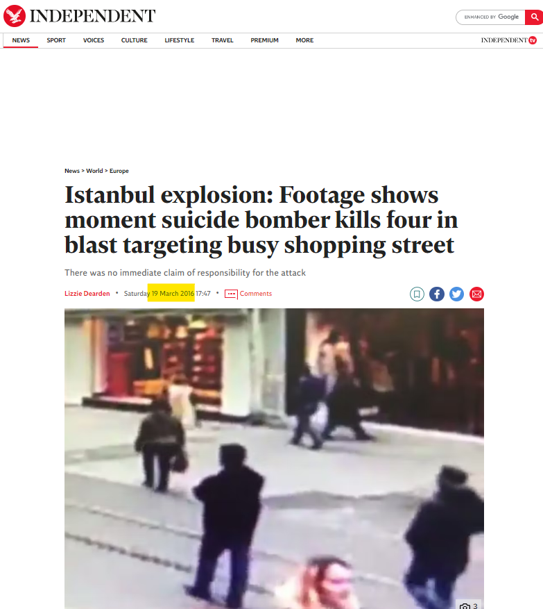 19 Mart 2016 Taksim saldırısına ait görüntünün 6. saniyesinde ekranın üst kısmında “19/03/2016” tarihi görülüyor.
