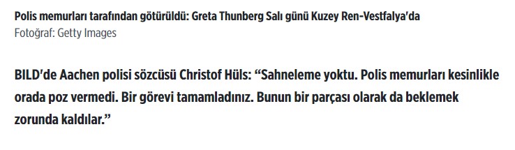 Ancak polislerin kolundan tutarak alandan uzaklaştırdığı Thunberg’in kameralara gülümsemesinden yola çıkarak, bazı sosyal medya kullanıcıları ve haber kaynakları tüm bunların bir “kurgu, mizansen” olduğunu iddia etmişler.