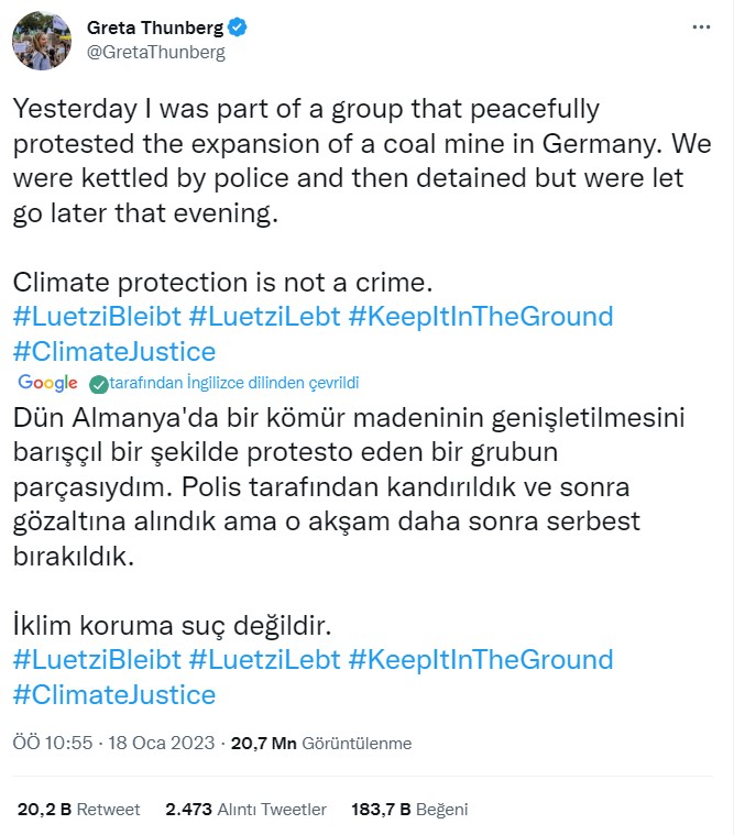 Dünyada yaptığı iklim krizi protestolarıyla bilinen genç aktivist Greta Thunberg, 17 Ocak 2023 Salı günü Batı Almanya’da bir madenin önünde diğer aktivistlerle eylem yaparken, polis tarafından önce uyarıldı. Ardından Thunberg ve diğer aktivistler polis tarafından gözaltına alındı. Reuters’ın haberinde, Thunberg, madenin yapısal olarak genişletilmesinin, 9 km mesafede bulunan Lützerath köyünün yok olma tehlikesi altında bırakacağı için protesto ettiği bilgisi yer alıyor.
