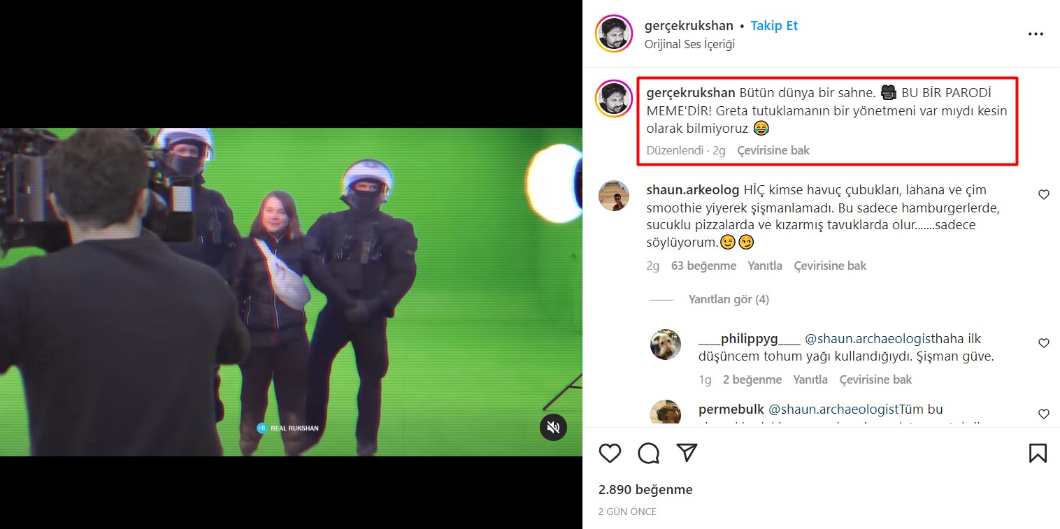 Videonun altında yer alan “REAL RUKSHAN” yazısını Google’da arattığımızda bazı sonuçlarla karşılaşıyoruz. Instagram’da bu ismi aradığımızda, videonun orijinal haline ulaşıyoruz. Kullanıcı bu videoyu Greta’nın gözaltına alındığı görüntülerin bir meme (mizahi içerik) haline getirdiğini belirtiyor.