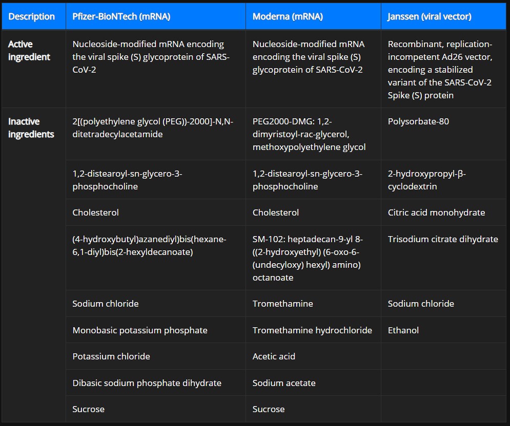Yaygın olarak kullanılan BioNTech(Pfizer), Moderna ve Johnson & Johnson aşılarının içeriğinde hangi maddelerin bulunduğu açıkça görülmektedir.