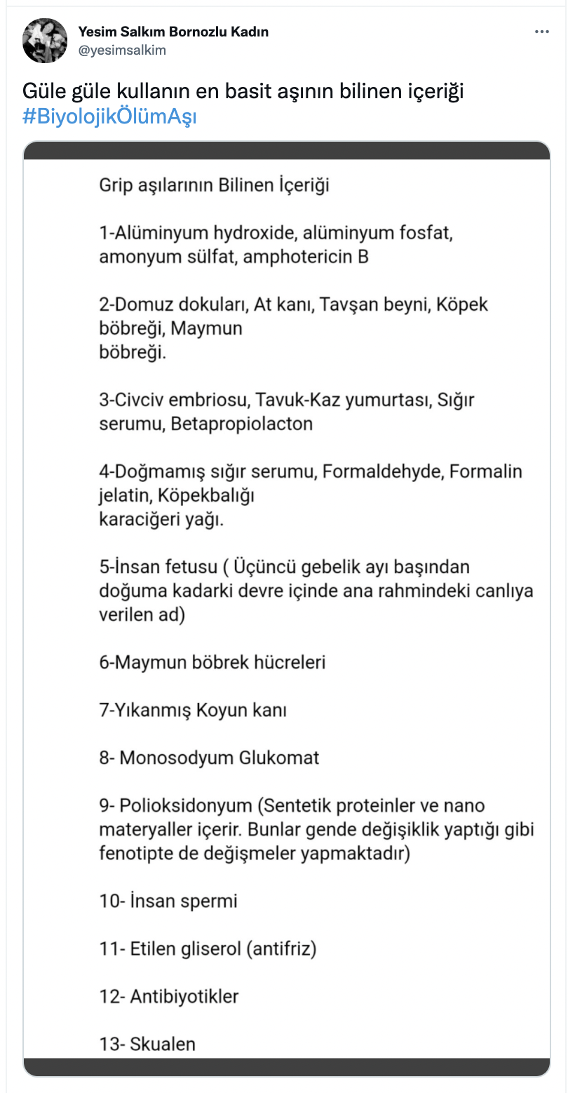 Covid-19 aşılarının içerdiği kimyasalların ne olduğu sosyal medyada tartışılıp üzerinde komplo teorileri üretiliyorken, Yeşim Salkım’ın geçtiğimiz günlerde Twitter hesabında, sözde “grip aşısının içeriğinde yer alan” bir listeyi Tweet atmıştı. Bu paylaşım Twitter ve Ekşi Sözlük‘te gündem olmuştu. Listeyi abartılı bulup mizahi bir yolla eleştiren bir sosyal medya kullanıcısı olmakla beraber, bazıları da bu paylaşımın gerçek olup olmadığını tartışmıştı.