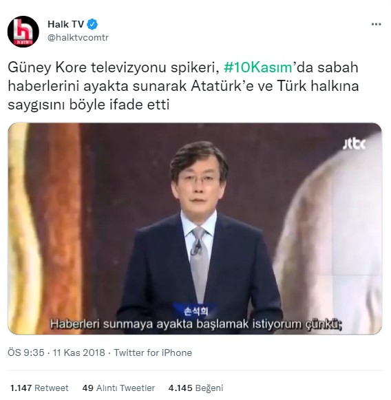Sosyal medyada uzun süredir paylaşılan bir iddiaya göre Güney Koreli spiker, Atatürk’e duyduğu saygıdan dolayı onunla ilgili bir haberi ayakta sunuyor.