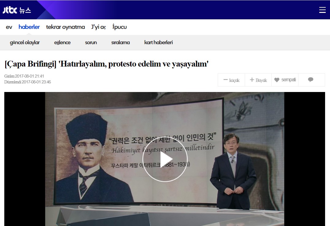 “Haberleri sunmaya ayakta başlamak istiyorum. Çünkü, bu sabah Türkiye İstanbul’daki Dolmabahçe Sarayı’ndaki bir ölüm tüm Türk halkını çok üzdü. Bu sabah saat 09:05’te Türkiye’nin kurucusu hayata gözlerini yumdu. Tam bu saatte Türk halkı kendilerine bağımsızlığı veren liderleri Atatürk için ayakta saygı duruşunda bulunuyorlar. Türklerin lideri hakimiyeti Osmanlı Padişahı’ndan alıp Türk halkına vermiş, yeni modern bir ülke kurmayı başarmıştı. Bugün Atatürk adı Incheon Buptung Park’ta bir tarihi alana verildi.”