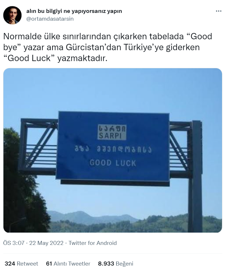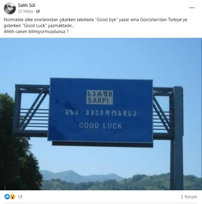 Gerçekten de Gürcistan Sarp Sınır Kapısı’ndan Türkiye’ye giriş yaparken İngilizce “İyi Şanslar” yazan tabela mevcutmuş. İngilizce yazının üzerinde ise Gürcüce “Yolun açık olsun” yazıyor.
