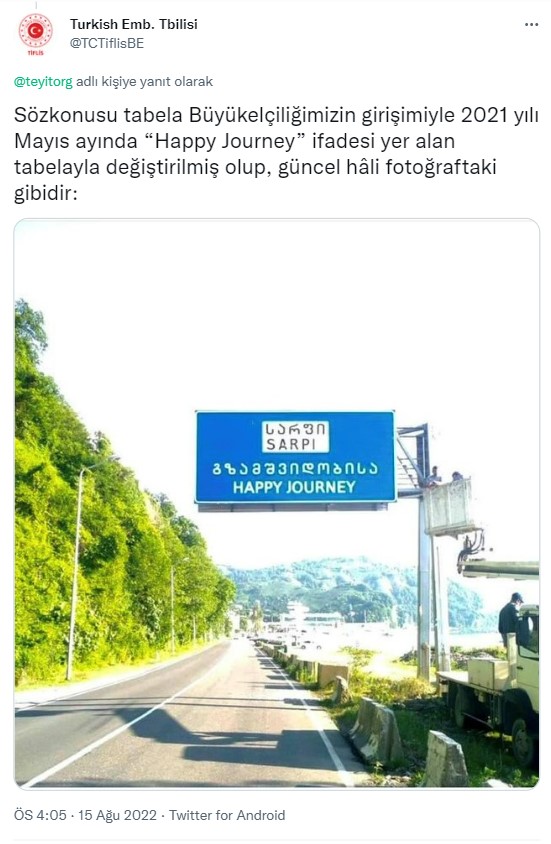 Türkiye – Gürcistan sınırındaki karşılama tabelasında 2021 yılı mayıs ayına kadar “Good Luck” yazıyordu. Tiflis’teki Türk Büyükelçiliği, Twitter üzerinden yaptığı paylaşımda, tabelanın “Happy Journey” ifadesiyle değiştirildiğini belirtti.