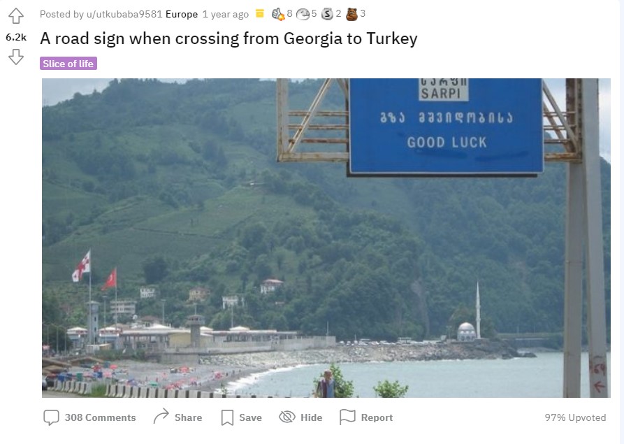 - Gürcistan – Türkiye arasındaki Sarp Sınır Kapısı’nın yakınlarında “Good Luck” yazılı tabela 2021’de “Happy Journey” ifadesiyle değiştirildi.