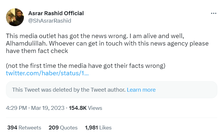“Bu medya kuruluşu haberi yanlış anlamış. Yaşıyorum ve iyiyim Elhamdülillah. Bu haber ajansıyla kim iletişime geçebilirse, lütfen gerçekleri kontrol ettirsin.”