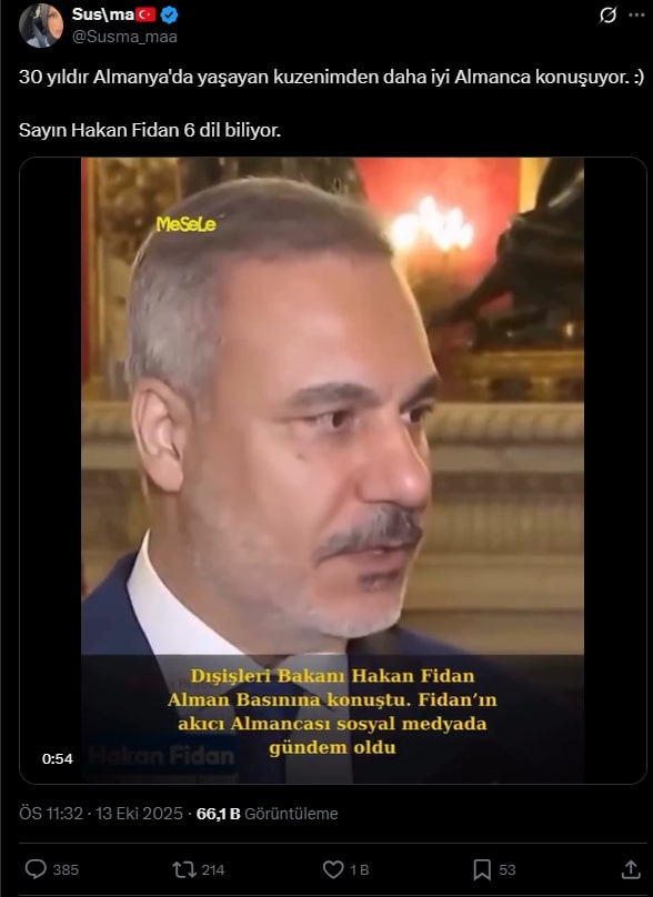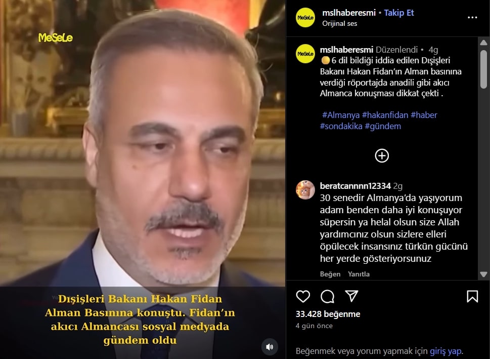 Sosyal medyada dolaşıma giren bir video Dışişleri Hakan Fidan’ın Almanca verdiği röportaj olduğu iddiasıyla paylaşıldı. Özellikle X (eski adıyla Twitter) ve Instagram gibi platformlarda, Hakan Fidan’ın Almanca konuştuğu iddiasıyla paylaşılan videolar büyük etkileşim aldı. Gelen yorumlarda pek çok kişinin kendisini övdüğü görülüyor. Peki bu video gerçek mi?
